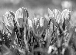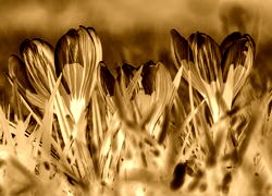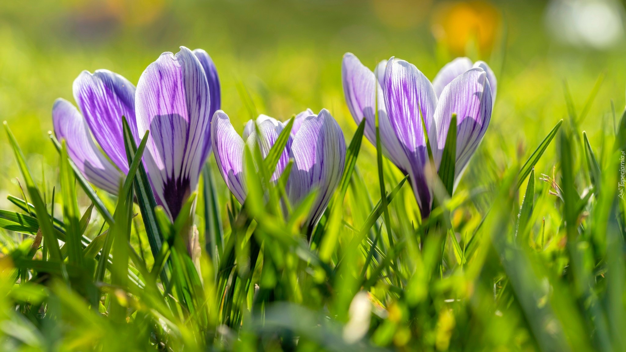 Edytor tapety: Rozświetlone słońcem trzy krokusy w trawie