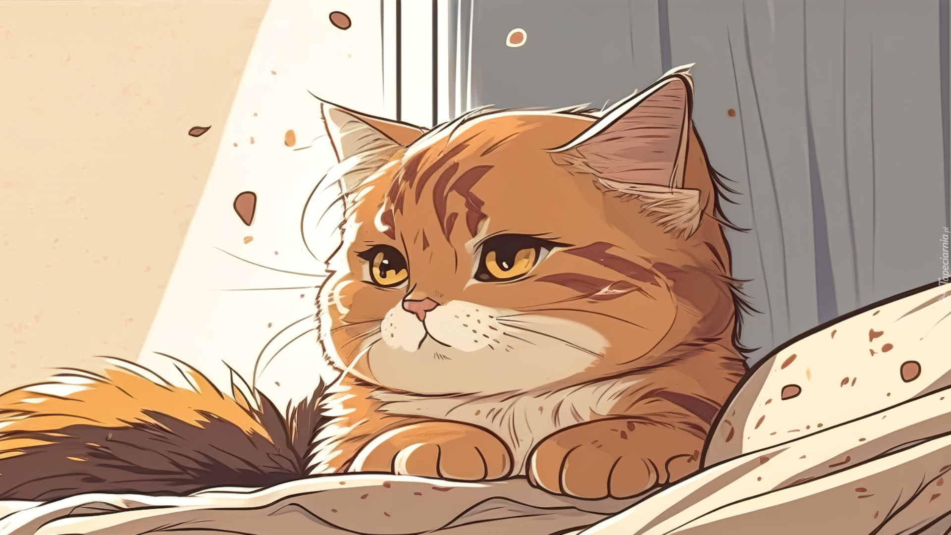 Edytor tapety: Puszysty biało-rudy kot na łóżku w grafice