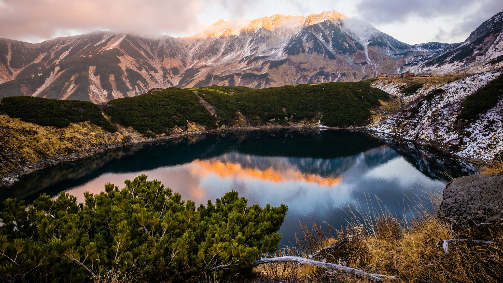 Edytor tapety: Trawy i drzewa nad górskim jeziorem