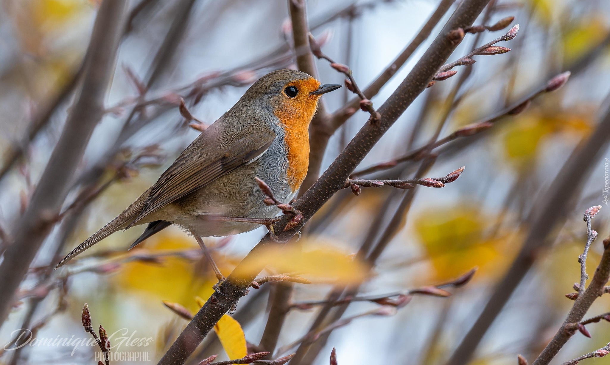 Edytor tapety: Rudzik na gałązce z pąkami liści