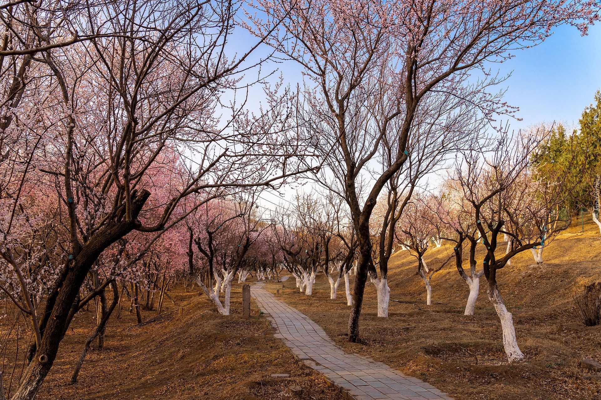 Edytor tapety: Rozkwitające drzewka owocowe w parku