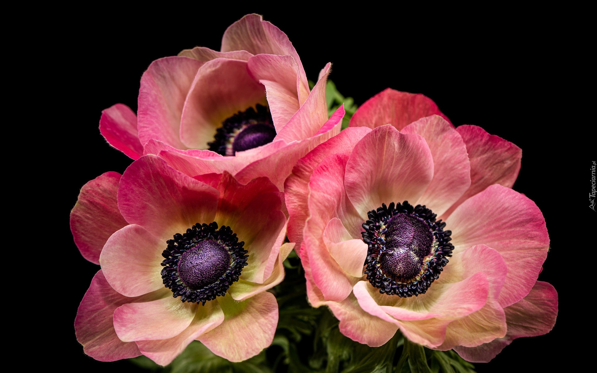 Edytor tapety: Trzy rozwinięte zawilce na czarnym tle