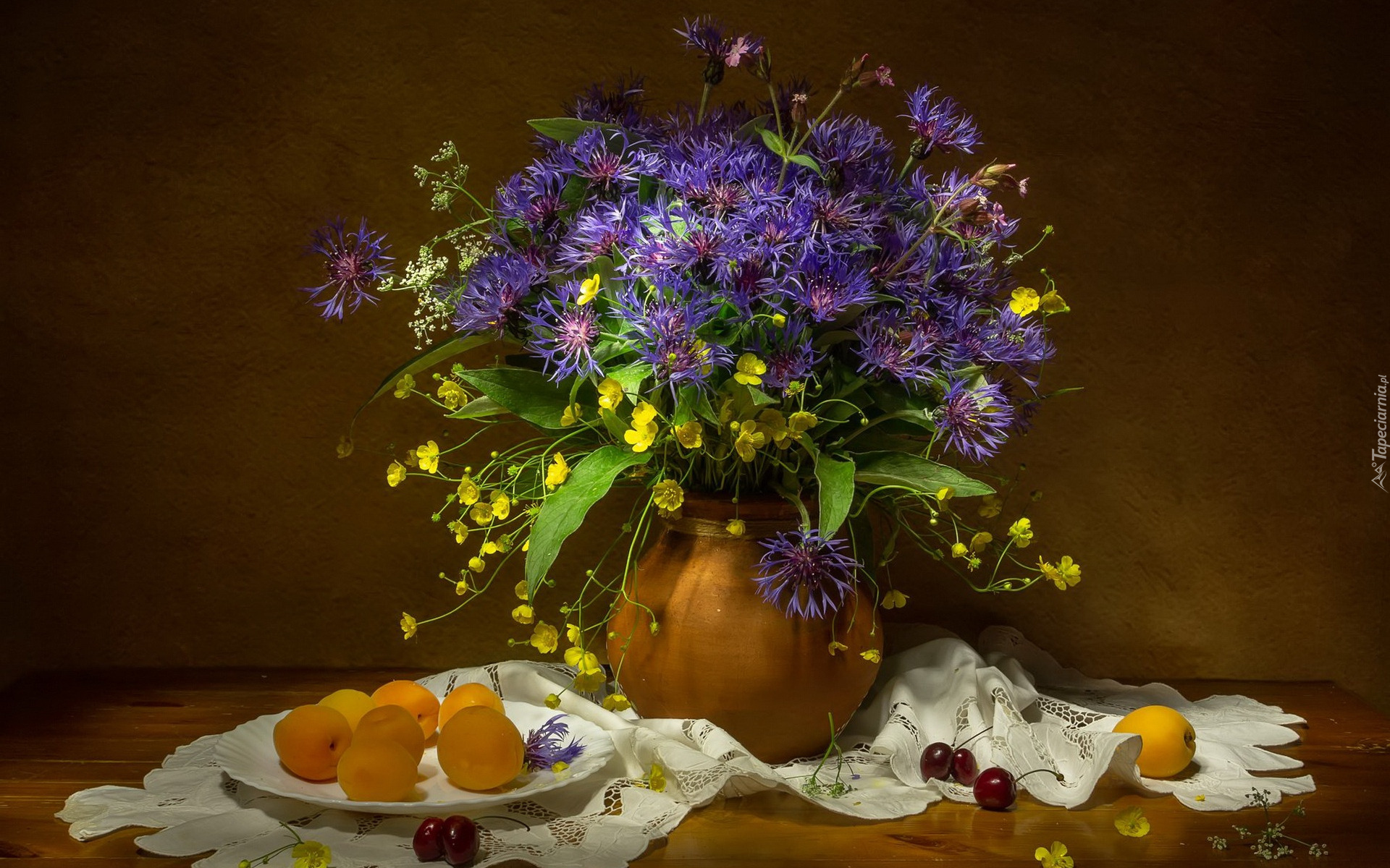 Edytor tapety: Chabry w wazonie obok moreli na talerzu