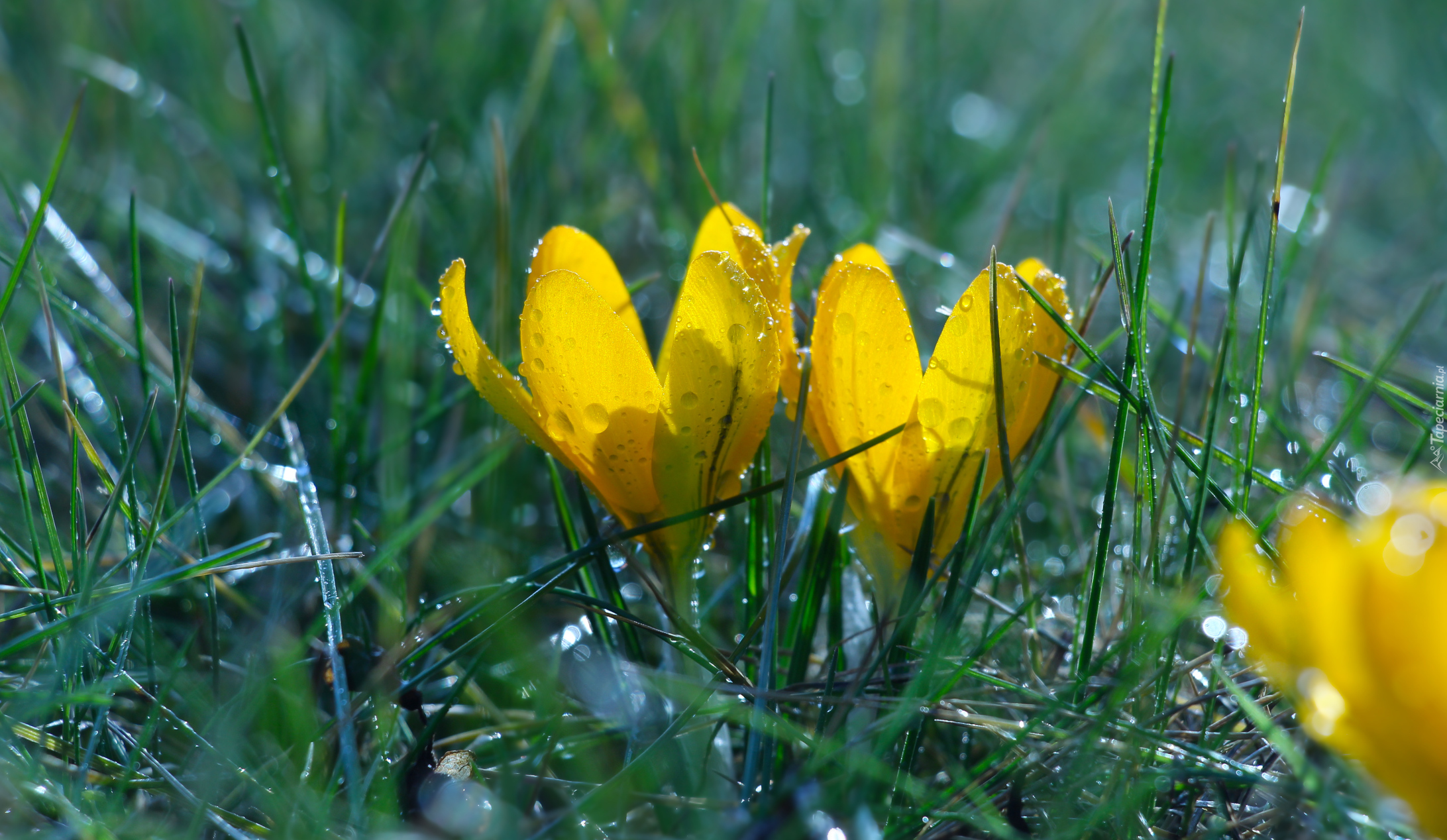Edytor tapety: Żółte krokusy z kropelkami wody w trawie