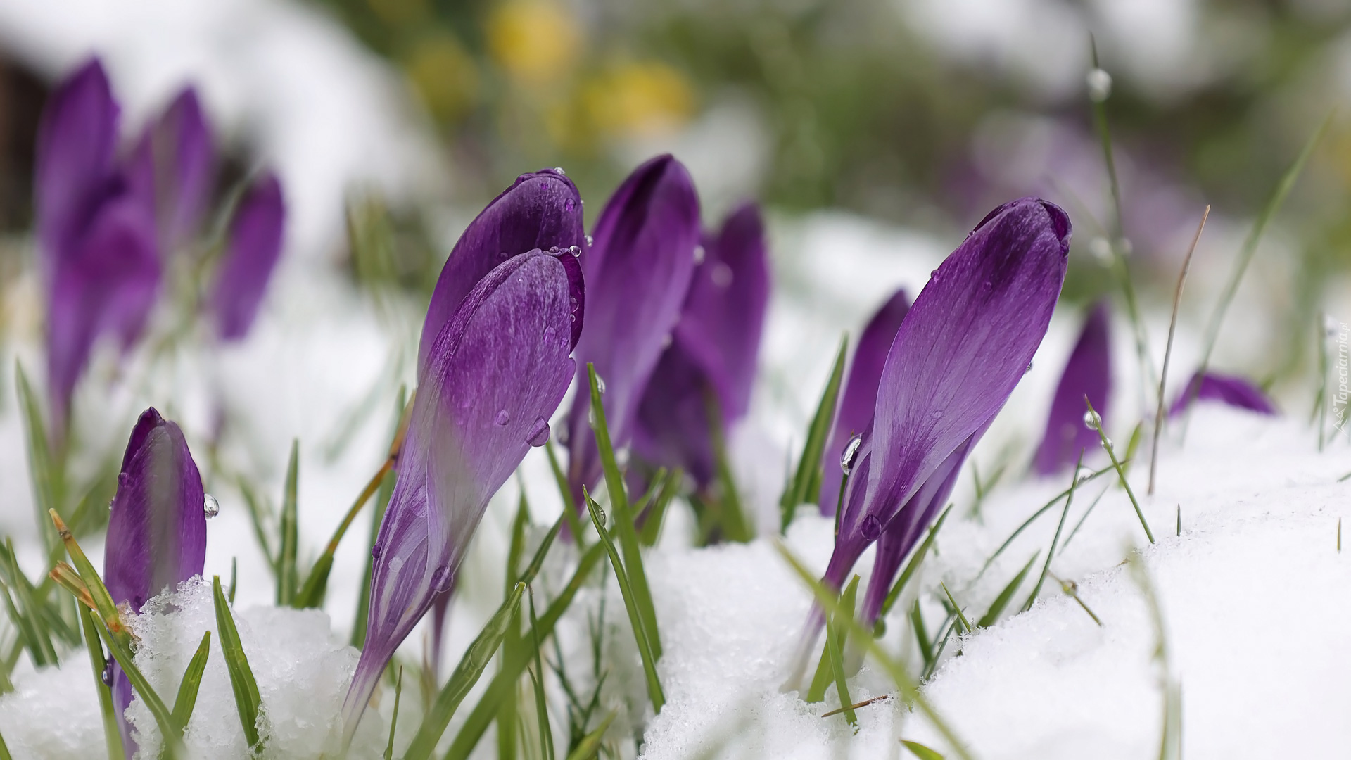 Edytor tapety: Wystajace fioletowe pąki krokusów spod śniegu