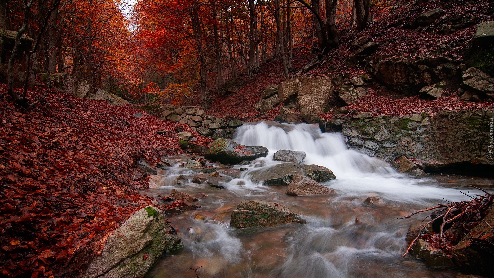 Edytor tapety: Płynąca rzeka w jesiennym lesie