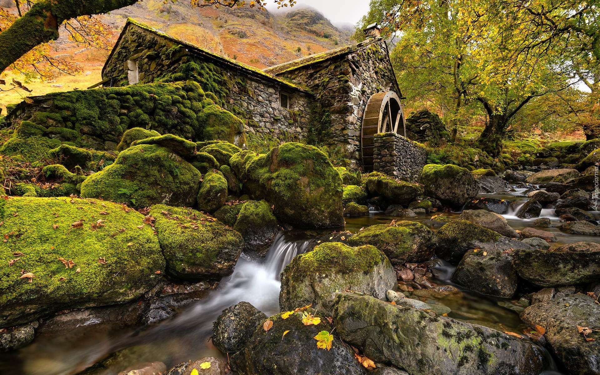 Edytor tapety: Młyn wodny otoczony omszonymi kamieniami w Borrowdale
