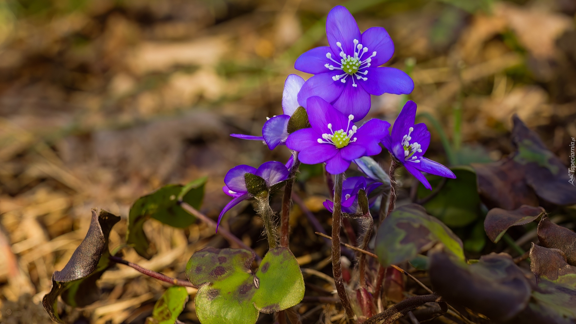 Edytor tapety: Kępka fioletowych przylaszczek na rozmytym tle