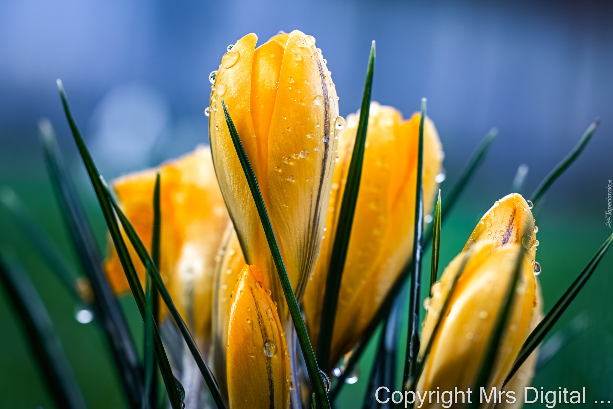 Edytor tapety: Mokre rozkwitające żółte krokusy