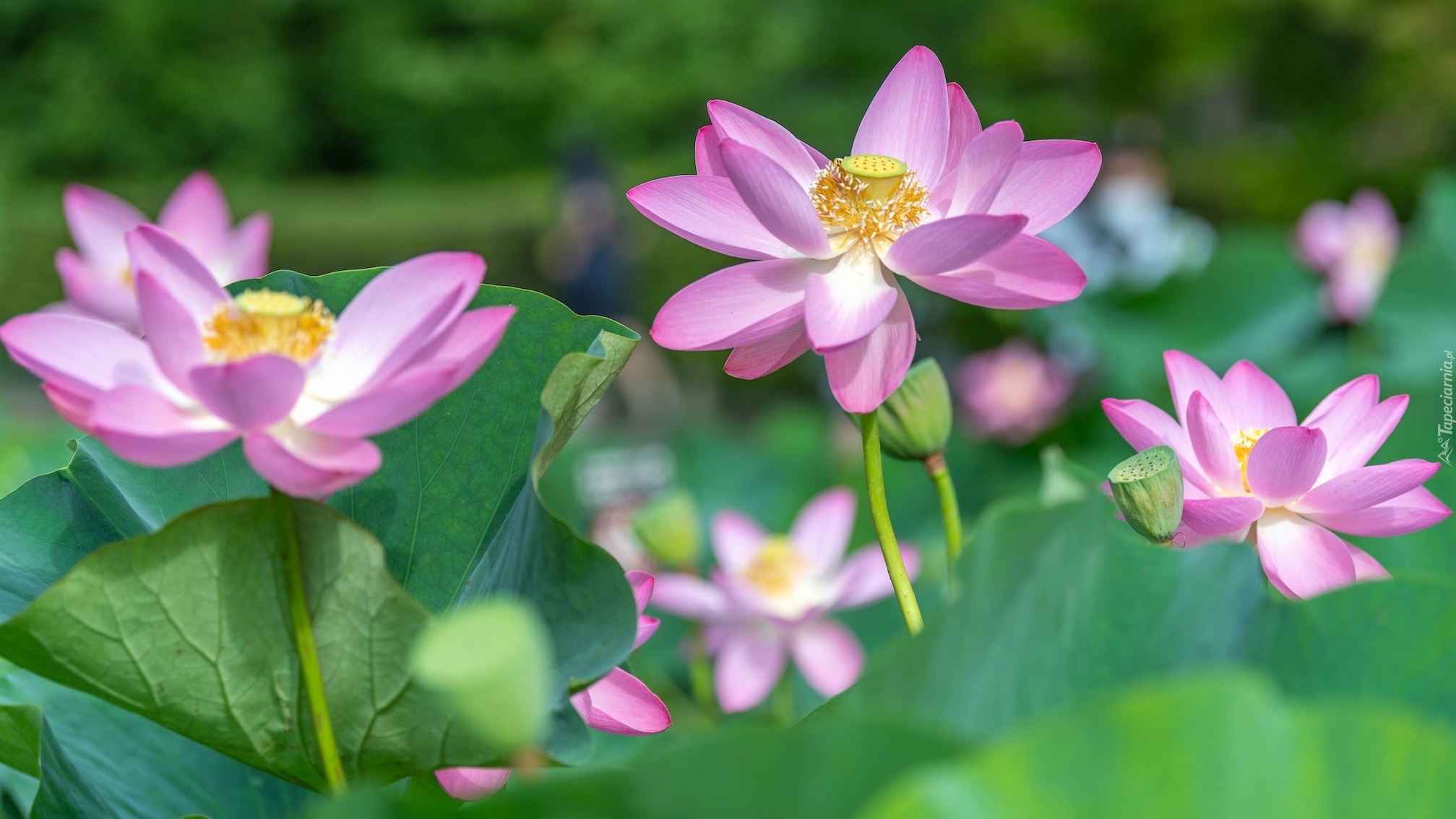Edytor tapety: Rozkwitnięte różowe kwiaty lotosu z liśćmi