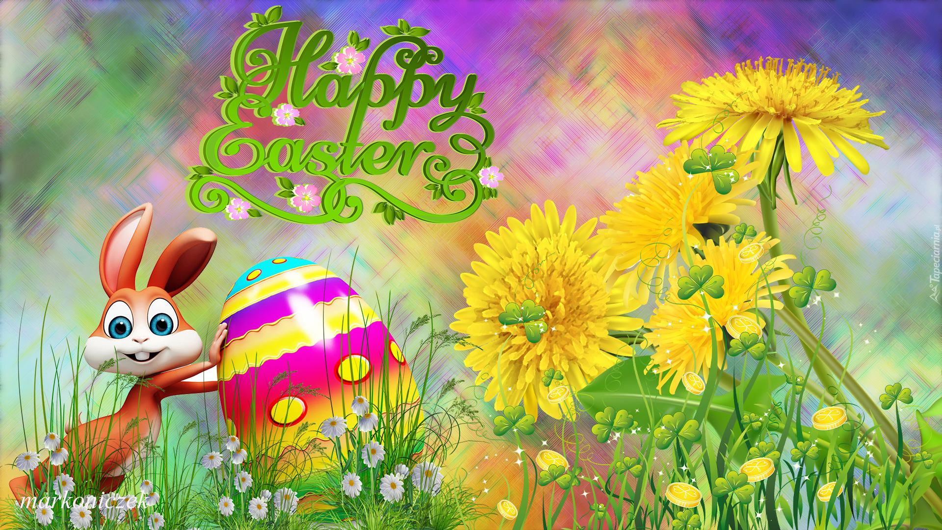 Edytor tapety: Zajączek z pisanką i wiosene kwiaty w grafice