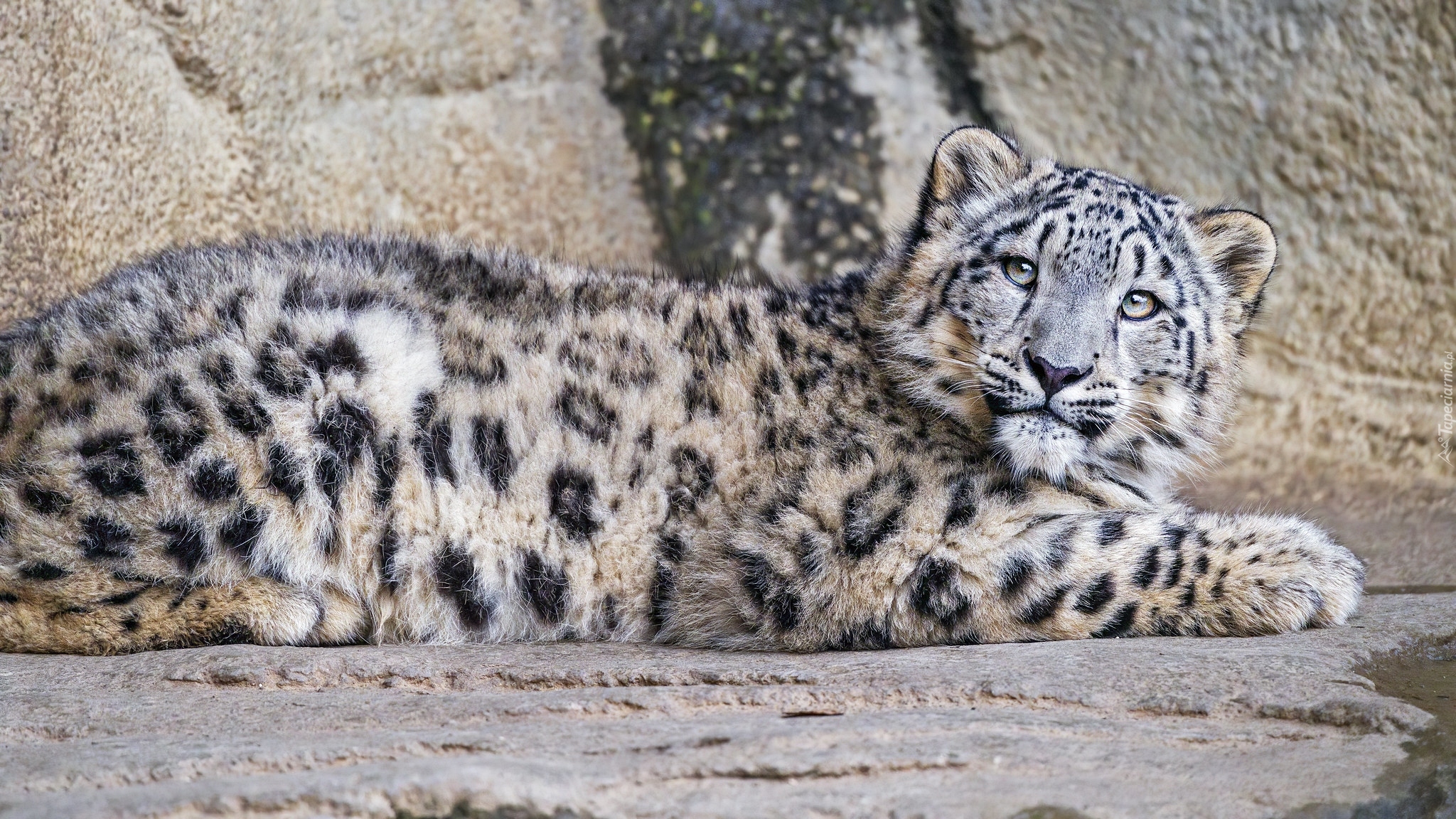Edytor tapety: Młody irbis śnieżny leżący na skale