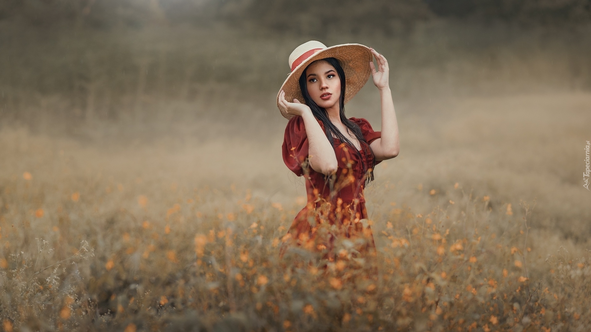 Edytor tapety: Długowłosa dziewczyna w kapeluszu na łące