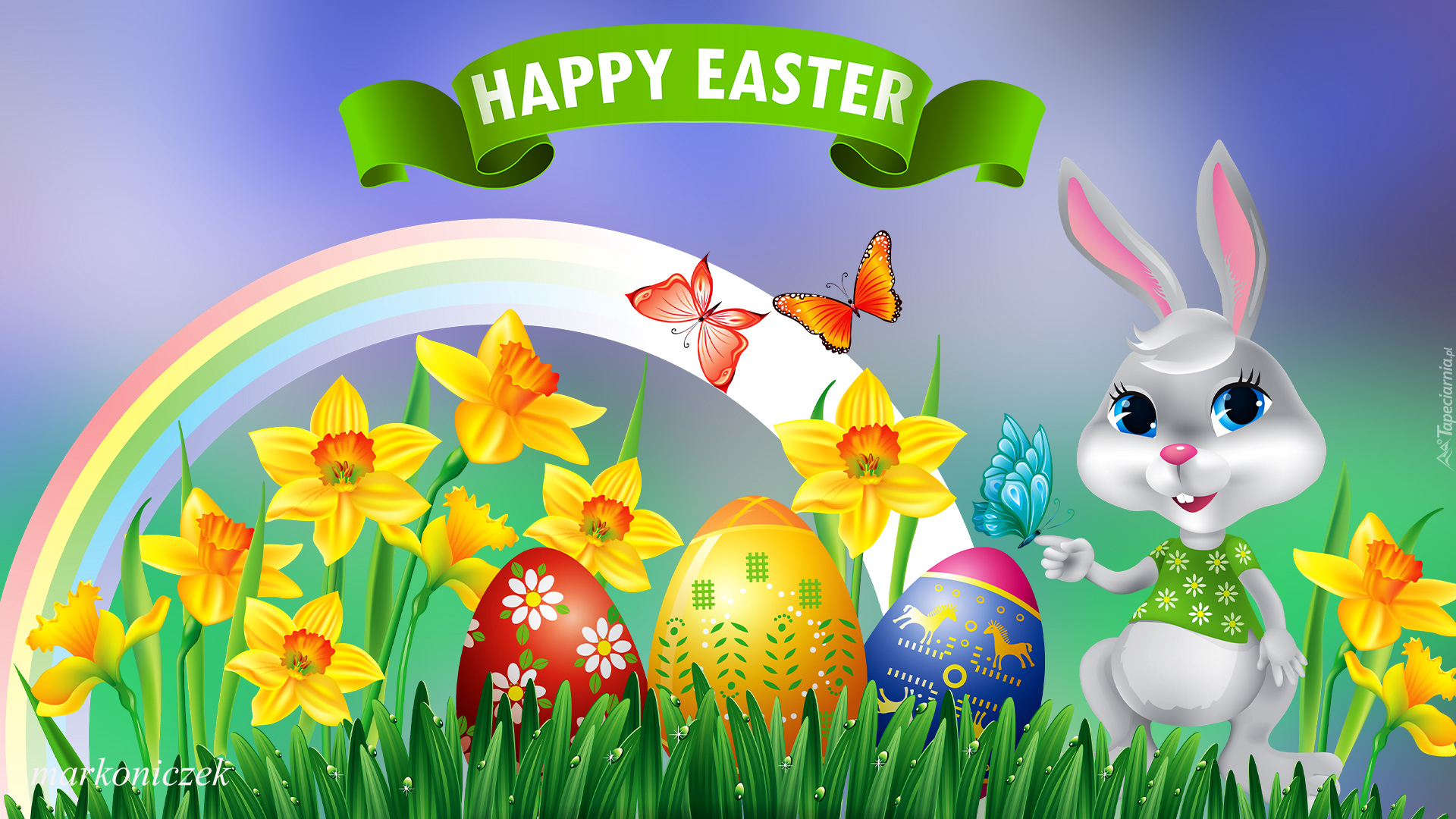 Edytor tapety: Zajączek obok tęczy nad pisankami