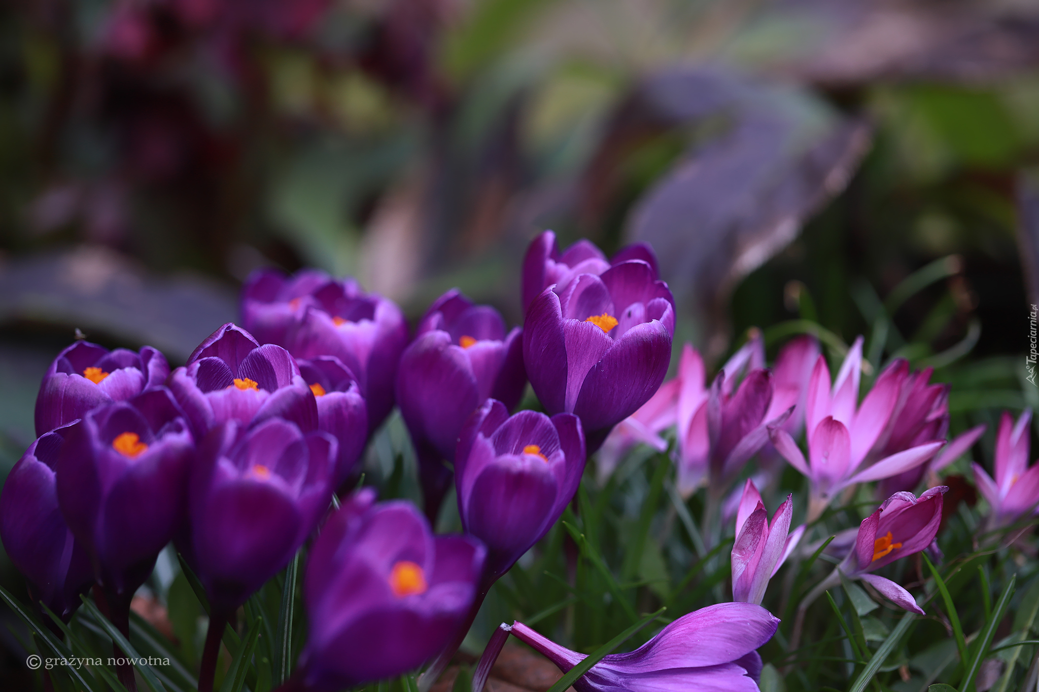 Edytor tapety: Kwitnące fioletowe krokusy z pręcikami w trawie