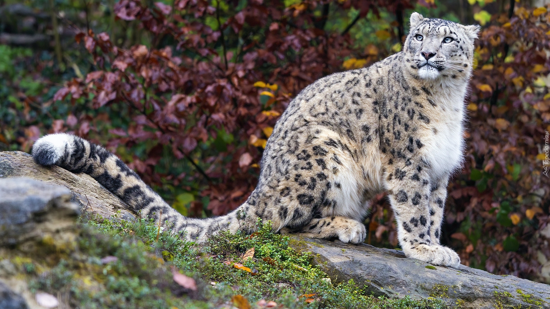 Edytor tapety: Zapatrzony irbis śnieżny siedzący na skale