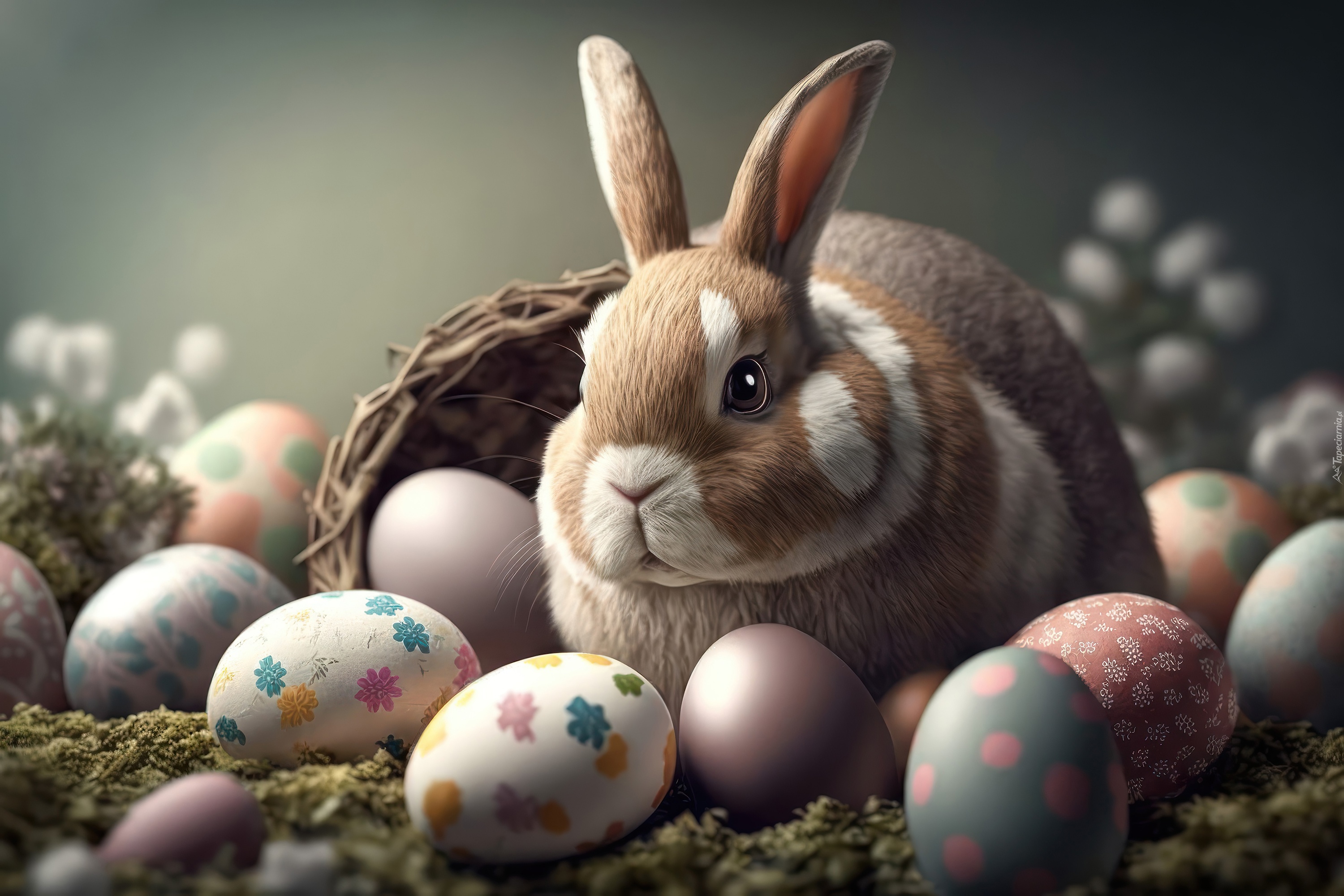 Edytor tapety: Królik obok koszyka i pisanek