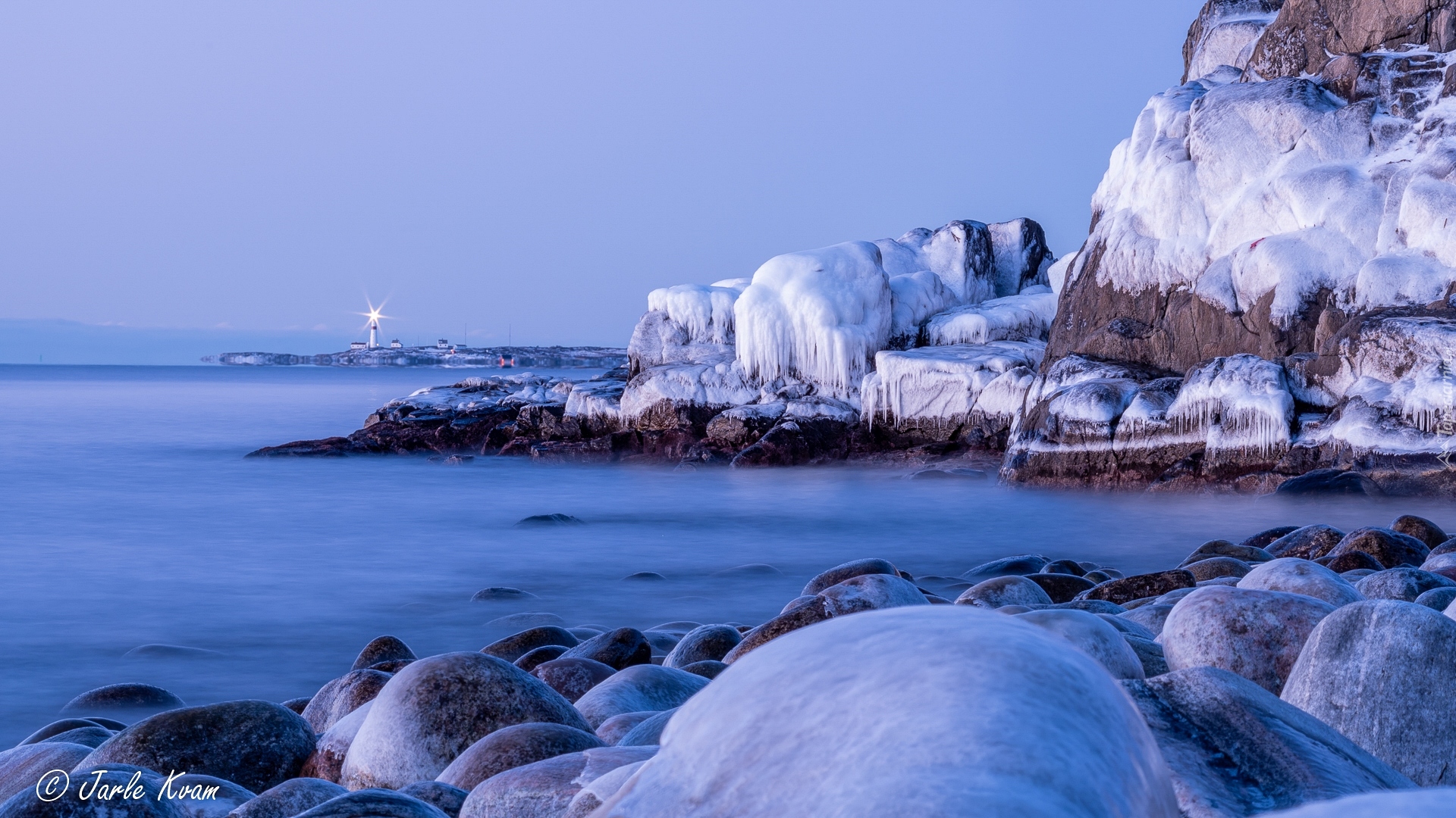 Edytor tapety: Oblodzone skały i latarnia morska w tle