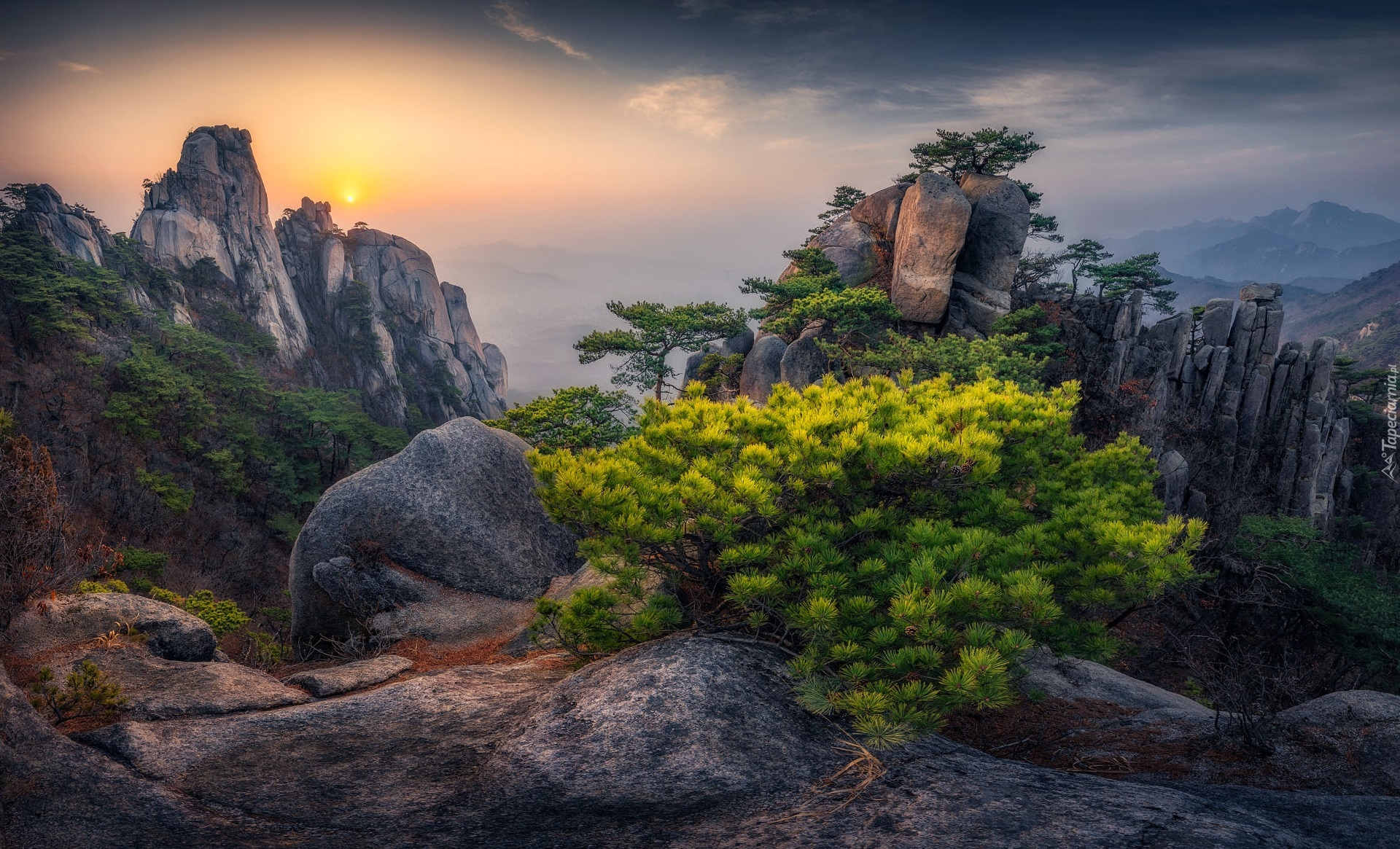 Edytor tapety: Sosny pomiędzy skałami na tle wschodu słońca