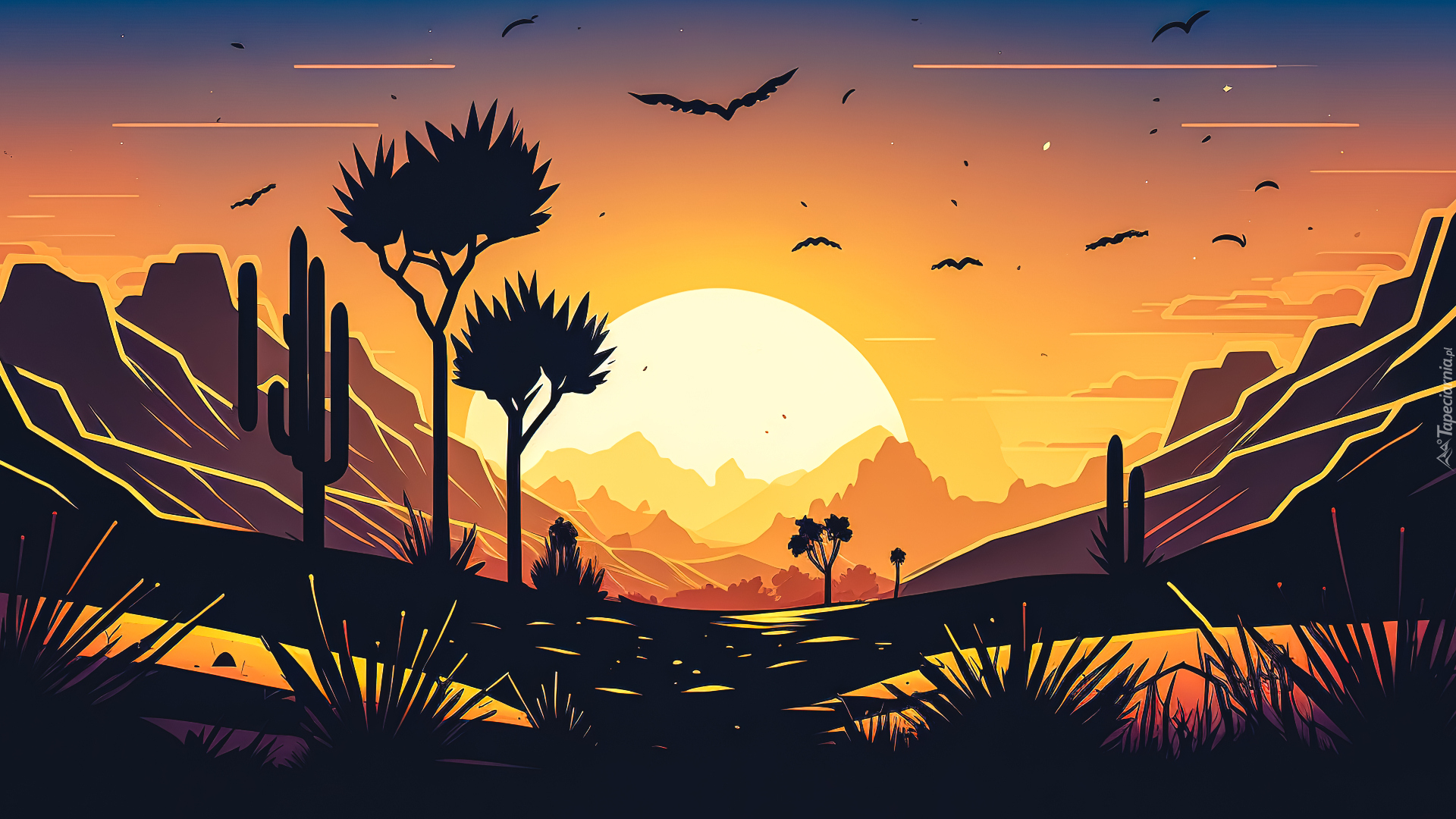 Edytor tapety: Rośliny i góry na tle zachodu słońca