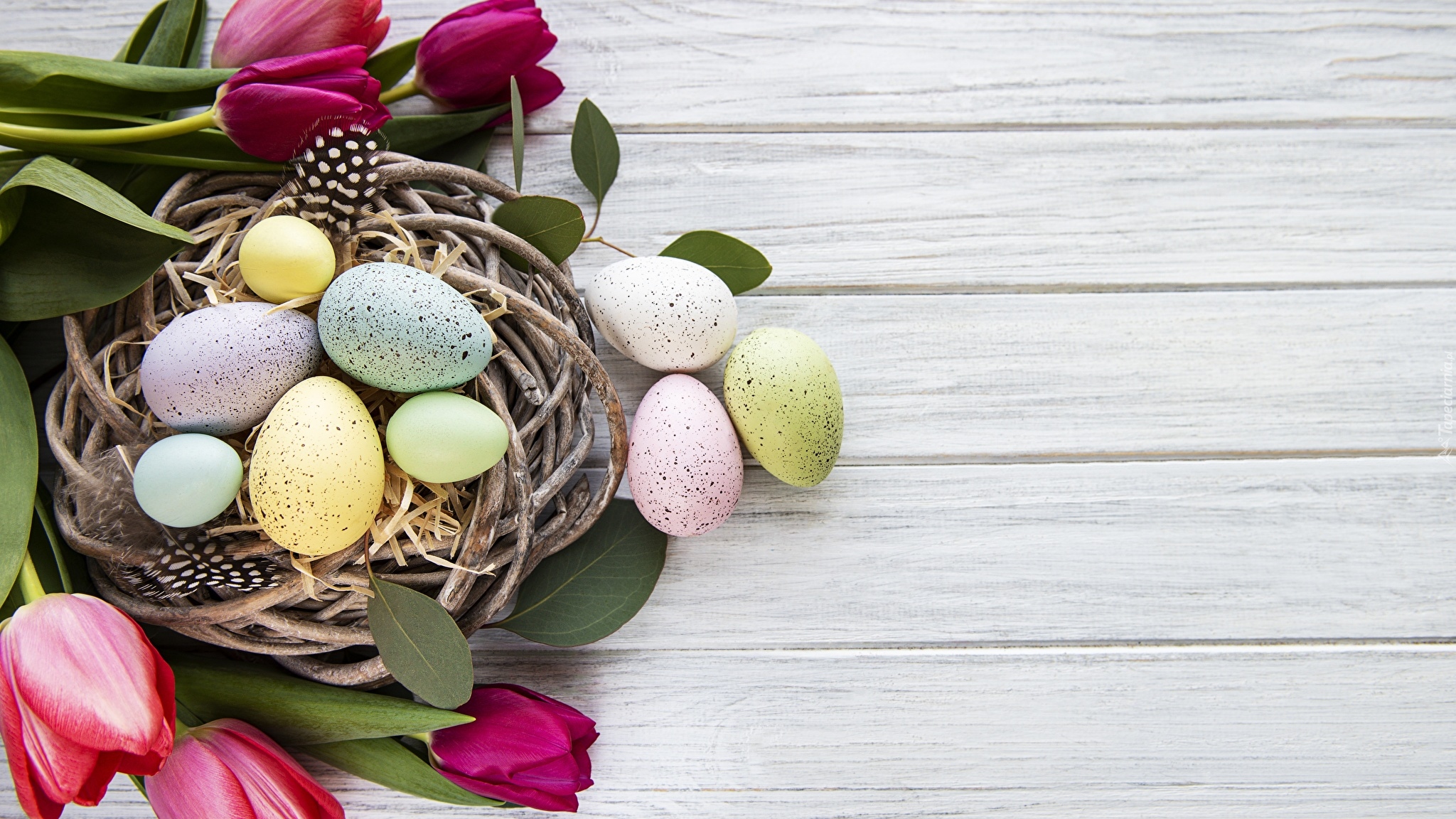 Edytor tapety: Tulipany obok pisanek w gnieździe na deskach