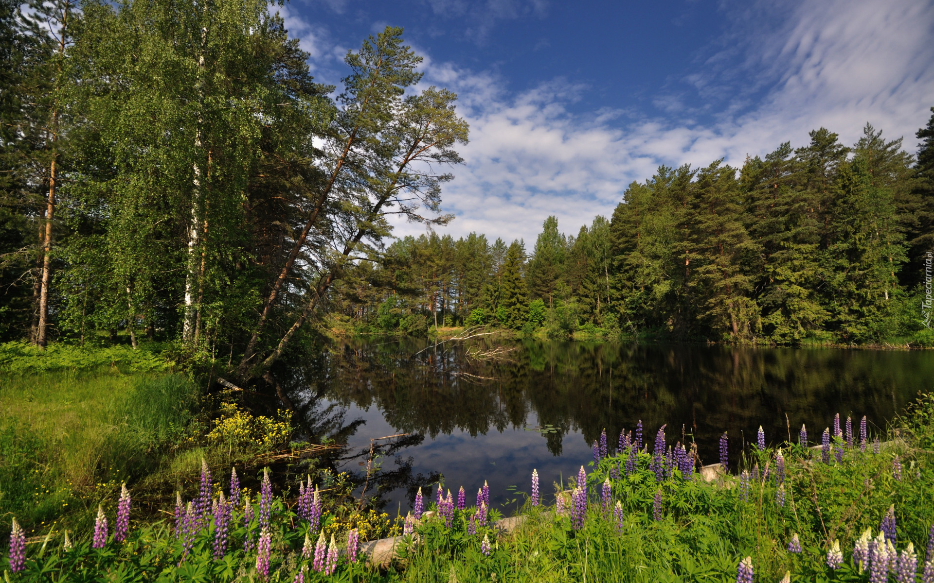 Edytor tapety: Łubin i drzewa na brzegu rzeki