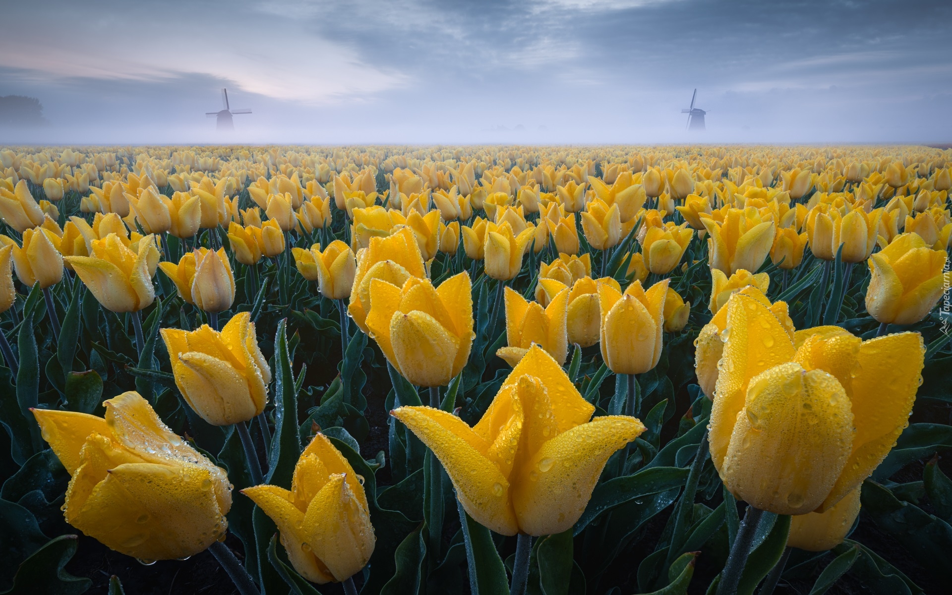 Edytor tapety: Mokre żółte tulipany na plantacji