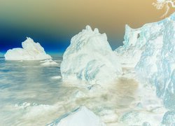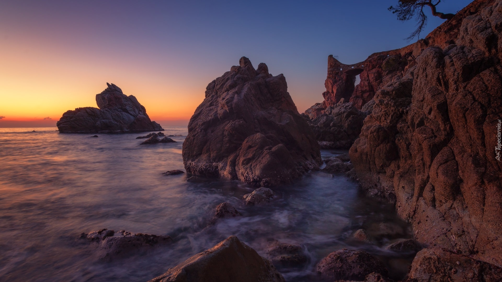 Edytor tapety: Rozświetlone blaskiem wschodzącego słońca skały w morzu
