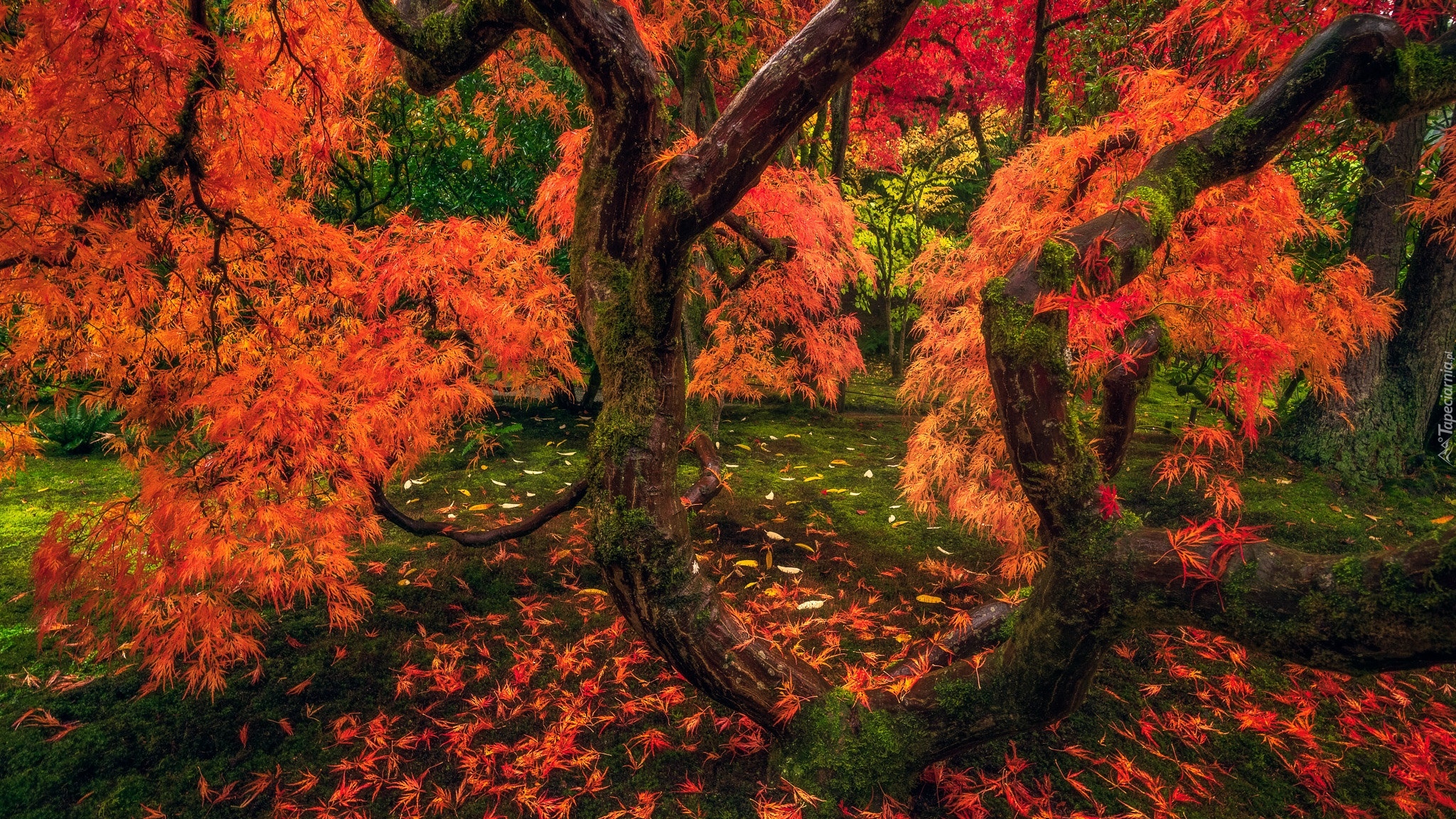 Edytor tapety: Czerwone liście klonu palmowego na gałęziach
