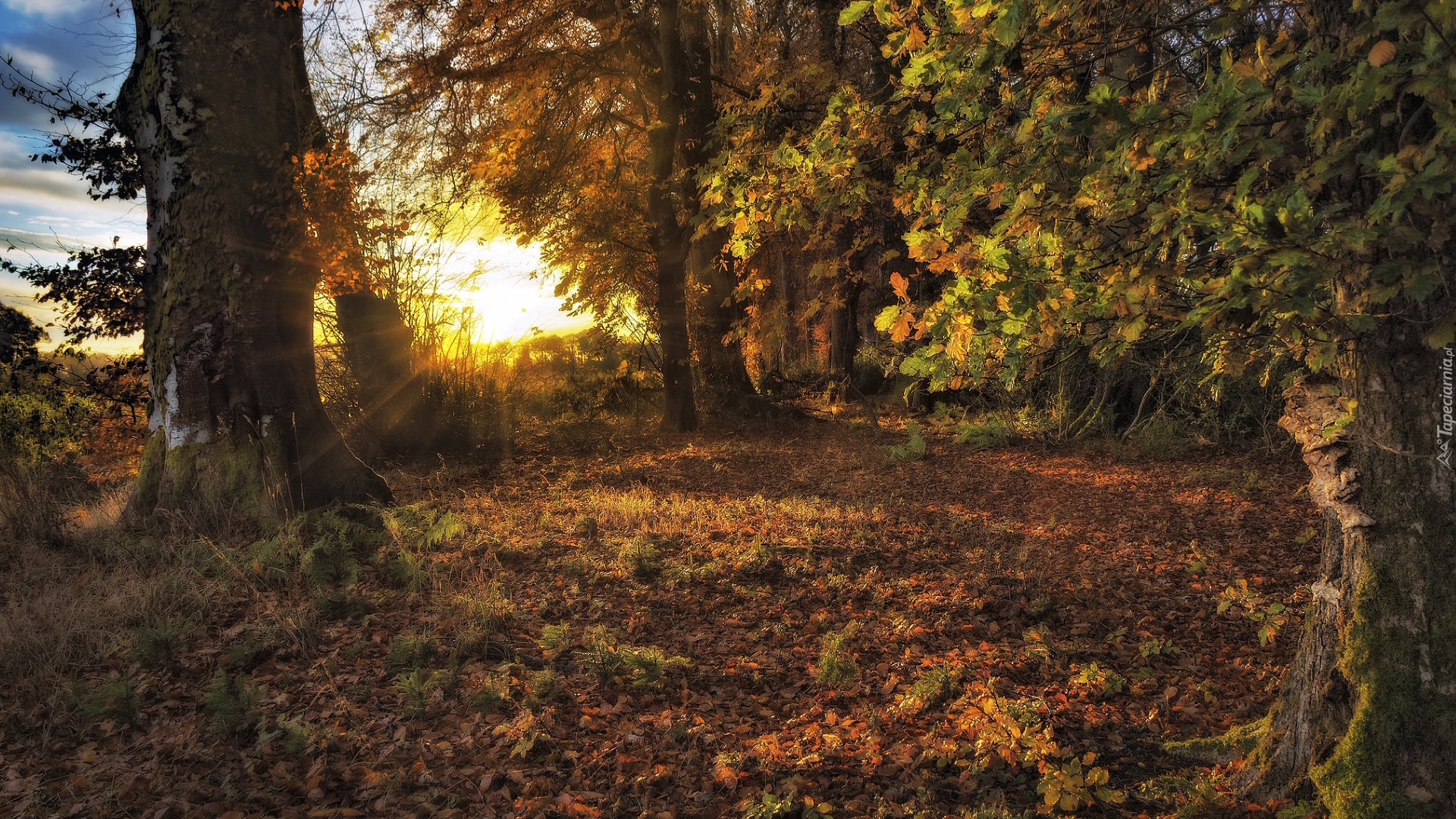 Edytor tapety: Rozświetlone promieniami słońca opadłe liście pod jesiennymi drzewami
