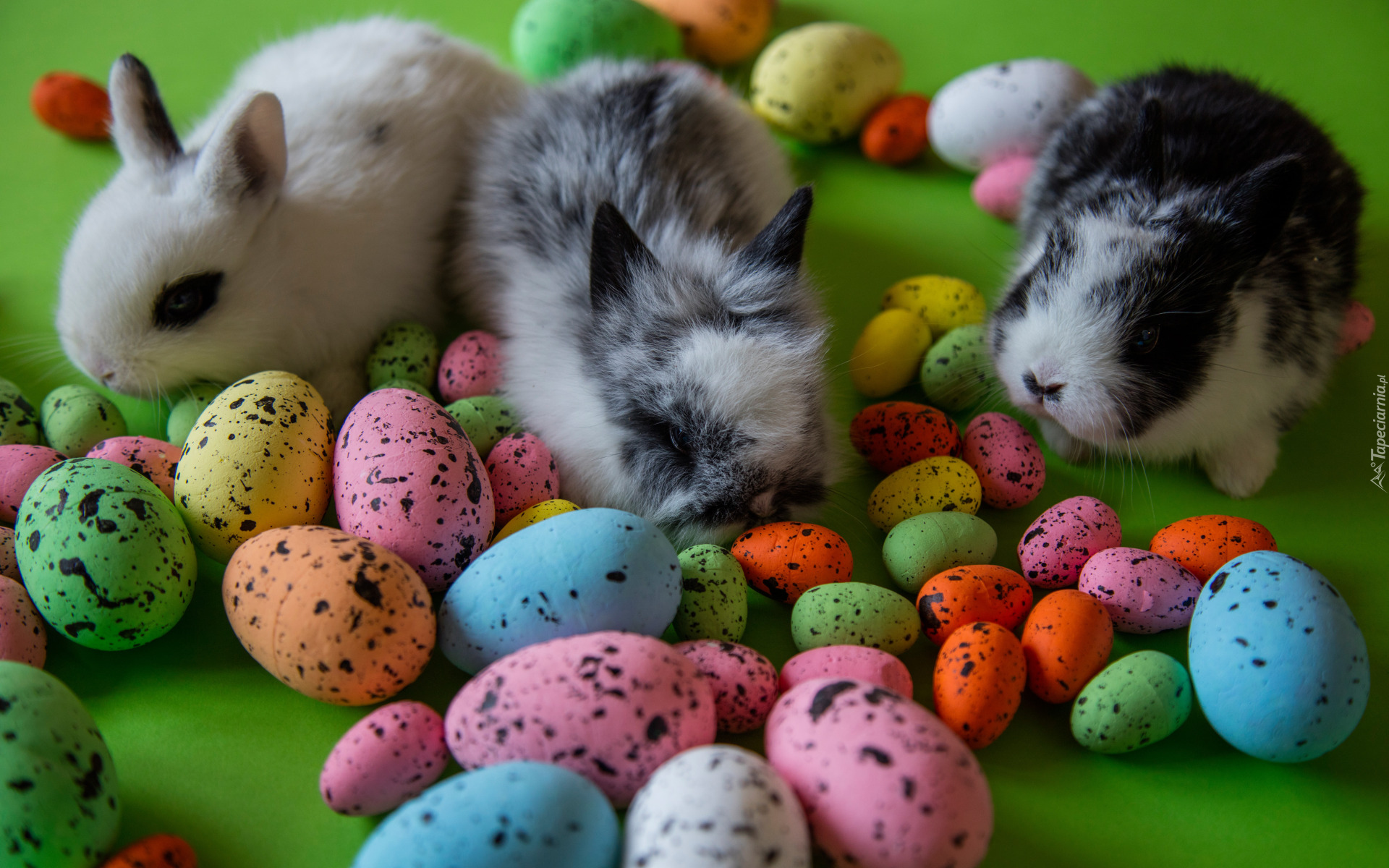 Edytor tapety: Trzy króliki wśród pisanek