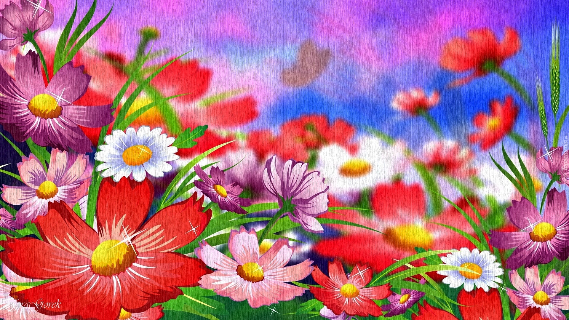 Edytor tapety: Kolorowe kwiaty w grafice 2D na rozmytym tle
