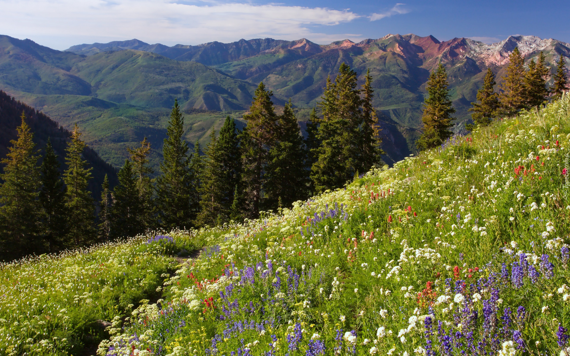 Edytor tapety: Okwiecona polana na tle gór
