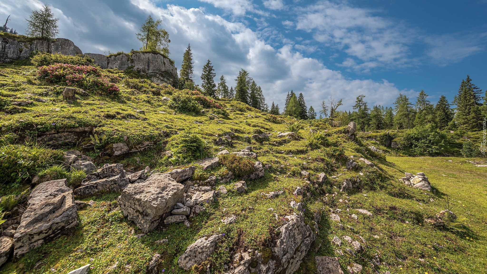 Edytor tapety: Chmury nad skałami i drzewami na wzgórzu