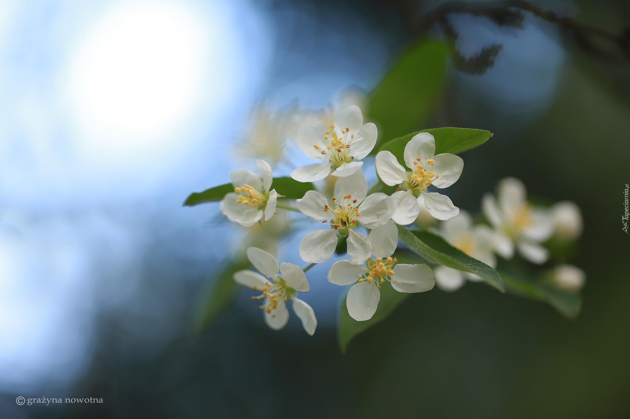 Edytor tapety: Białe kwiaty jabłoni z listkami
