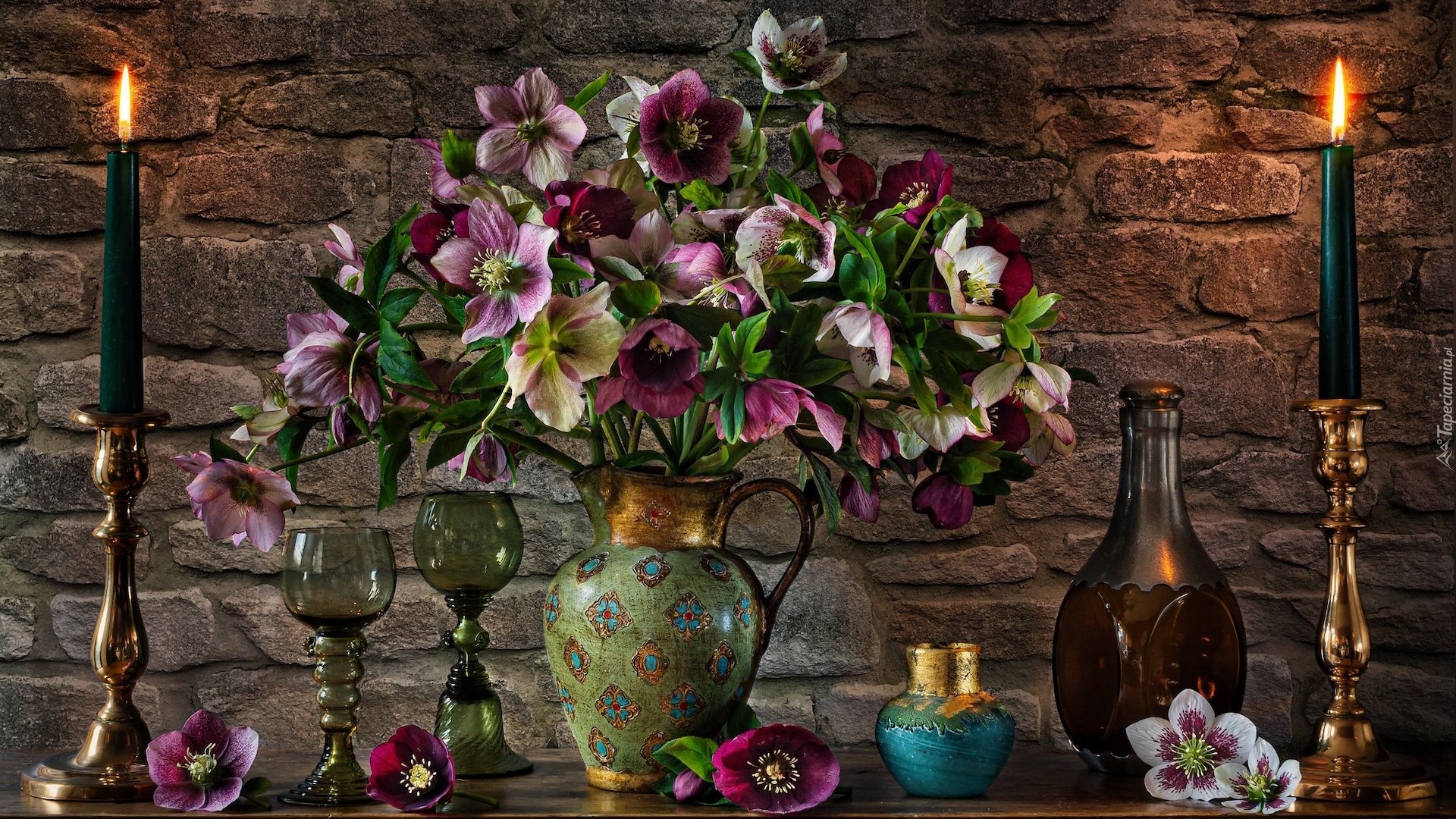 Edytor tapety: Bukiet ciemierników obok świeczników i karafki