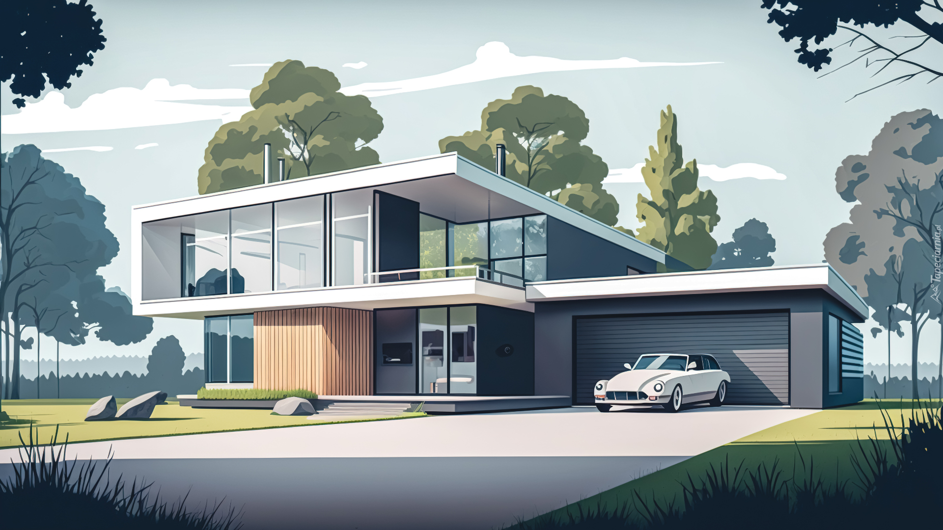 Edytor tapety: Samochód przed garażem nowoczesnej willi w grafice