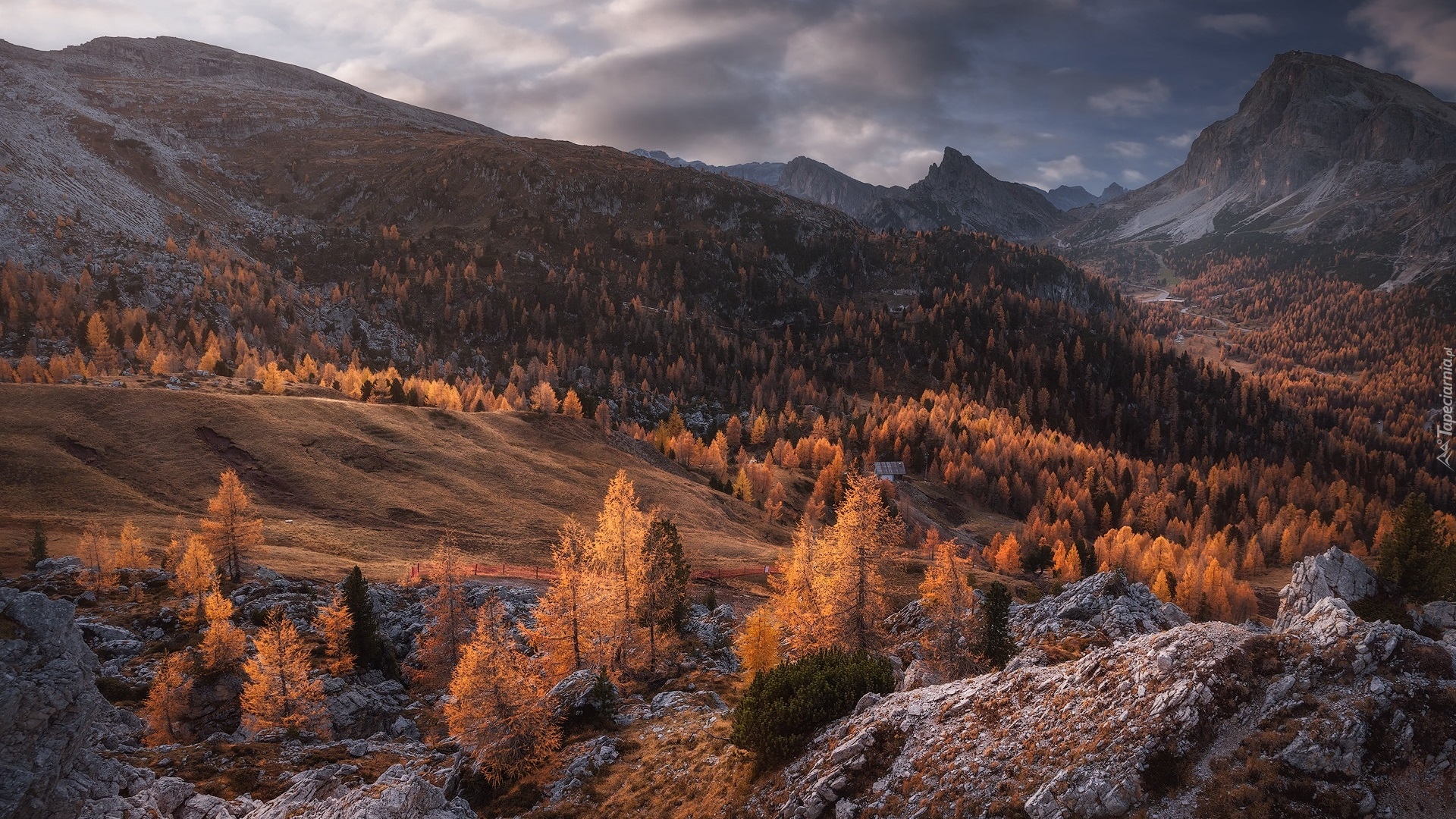 Edytor tapety: Zalesione pożółkłymi modrzewiami zbocza gór pod chmurami