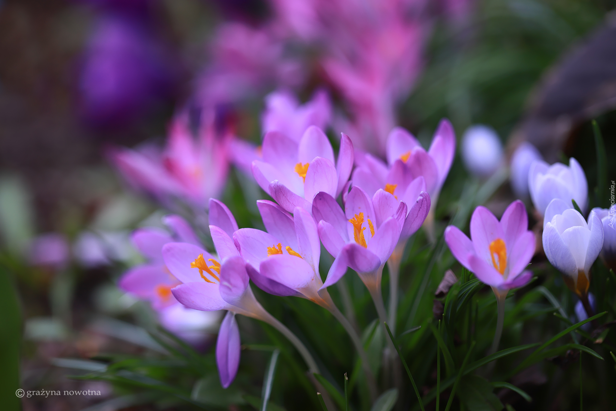 Edytor tapety: Rozświetlone słońcem kwitnące fioletowe krokusy