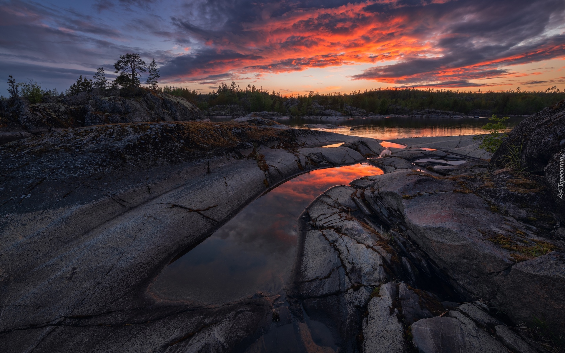 Edytor tapety: Skały na brzegu jeziora Ładoga pod kolorowymi chmurami