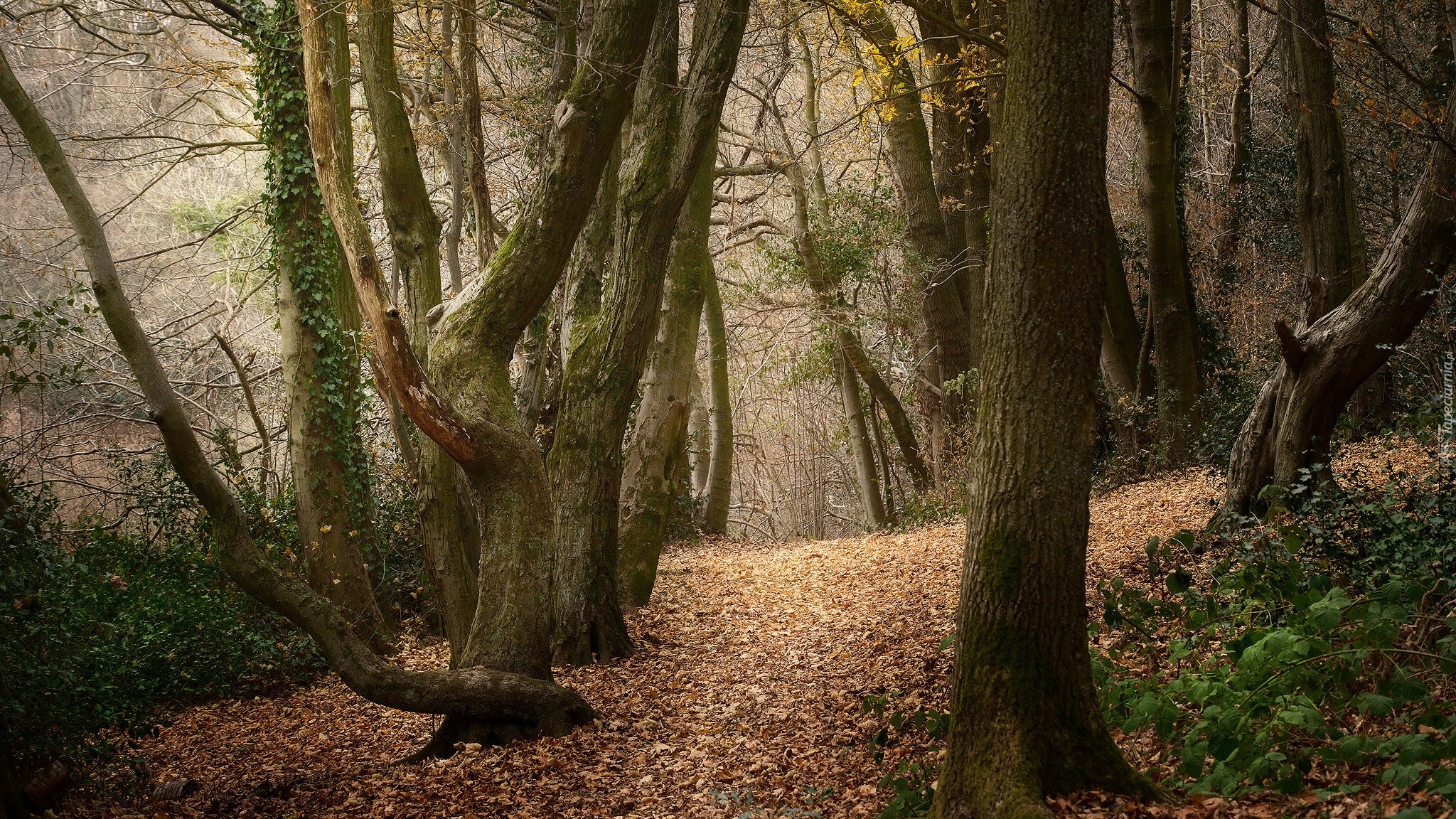 Edytor tapety: Opadłe liście i bluszcz na drzewie w lesie