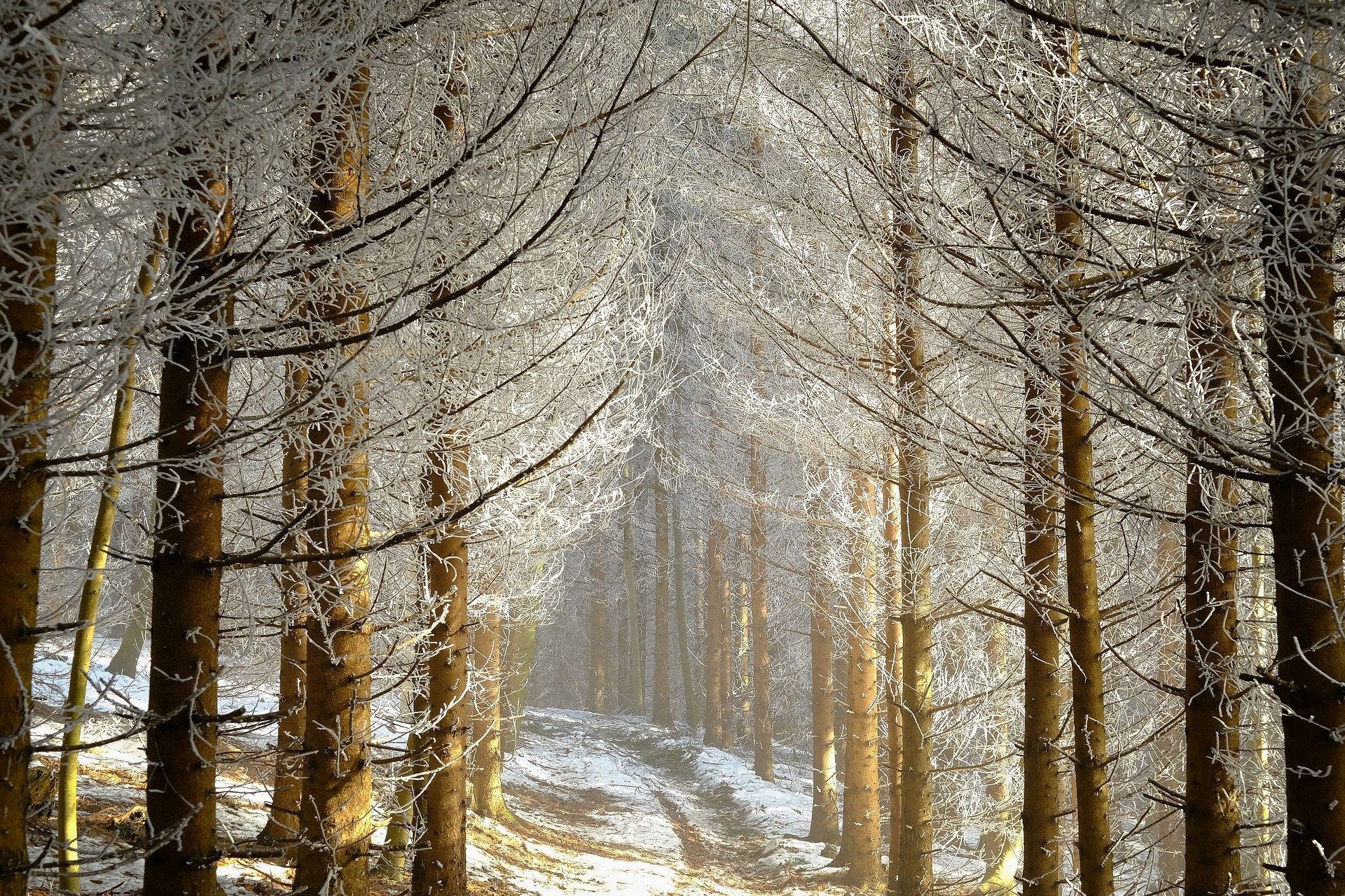 Edytor tapety: Oszronione wysokie drzewa wzdłuż drogi