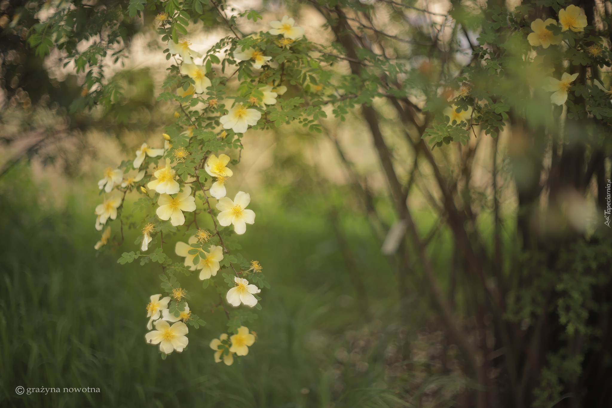 Edytor tapety: Żółte kwiaty dzikiej róży na gałązkach krzewu