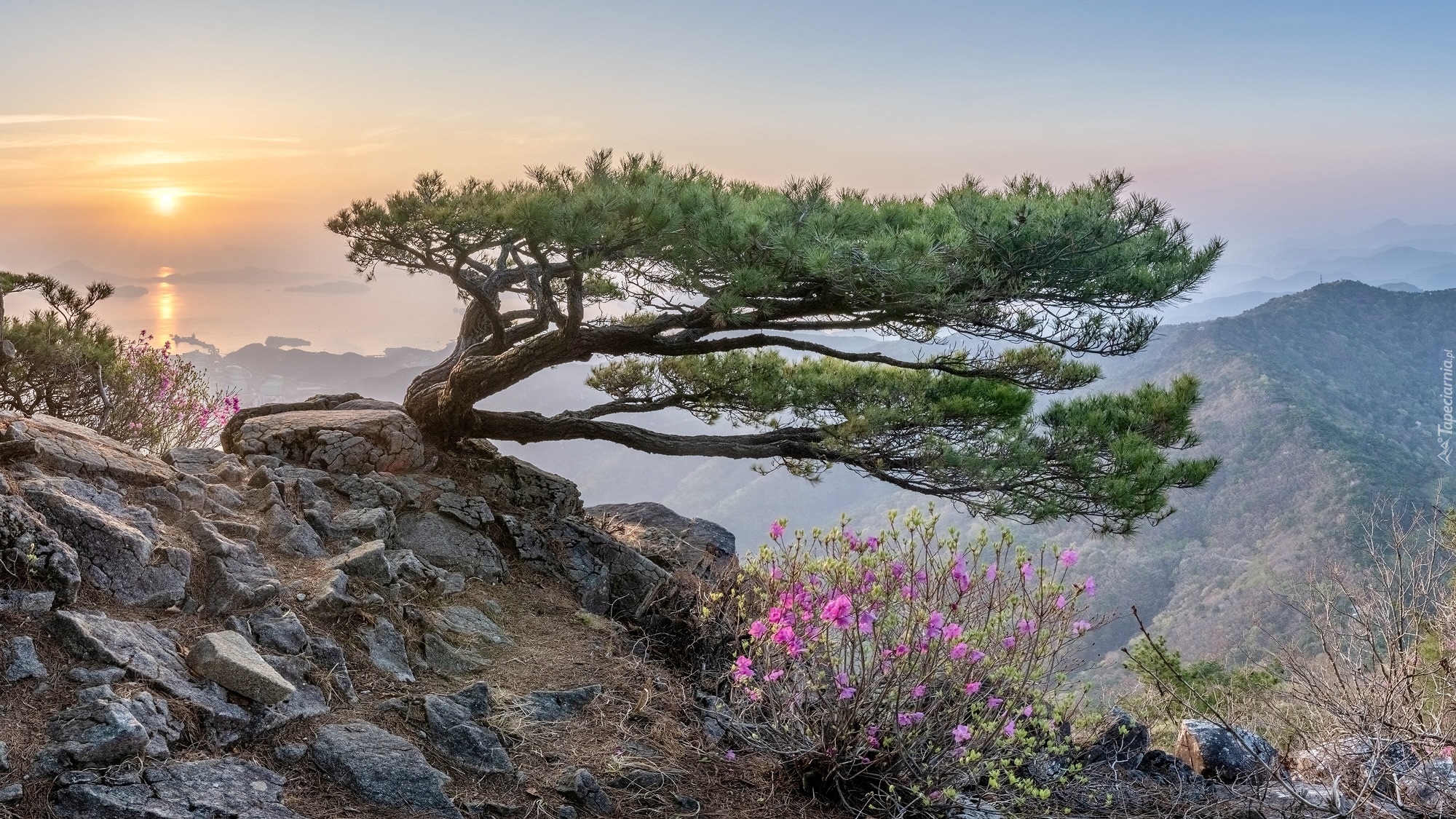 Edytor tapety: Kępka kwiatów obok sosny na skale
