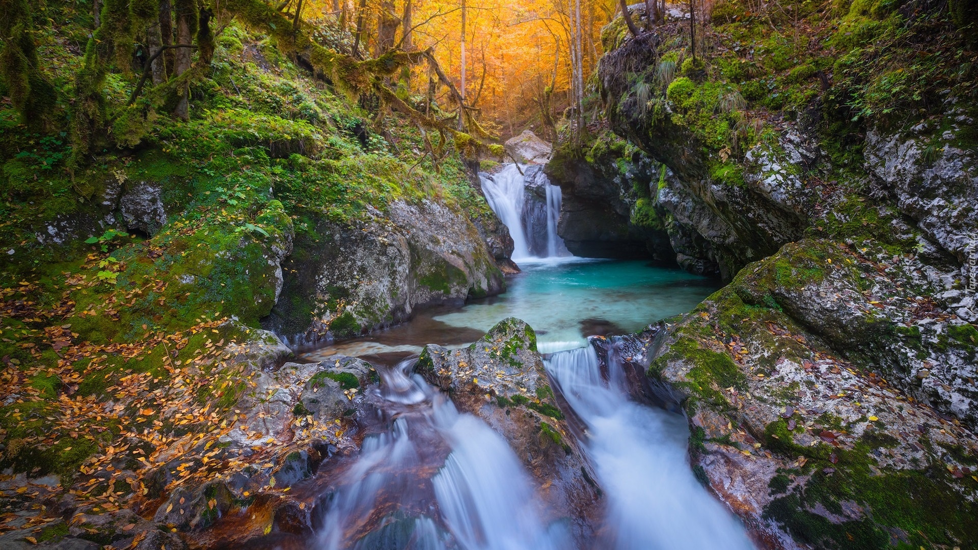 Edytor tapety: Omszałe drzewa i skały nad rzeką