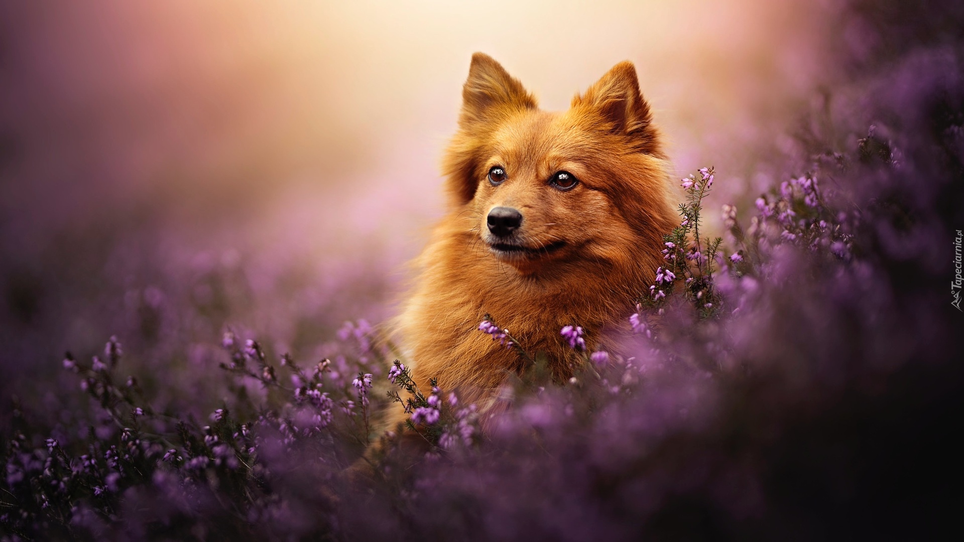 Edytor tapety: Brązowy szpic wśród wrzosów