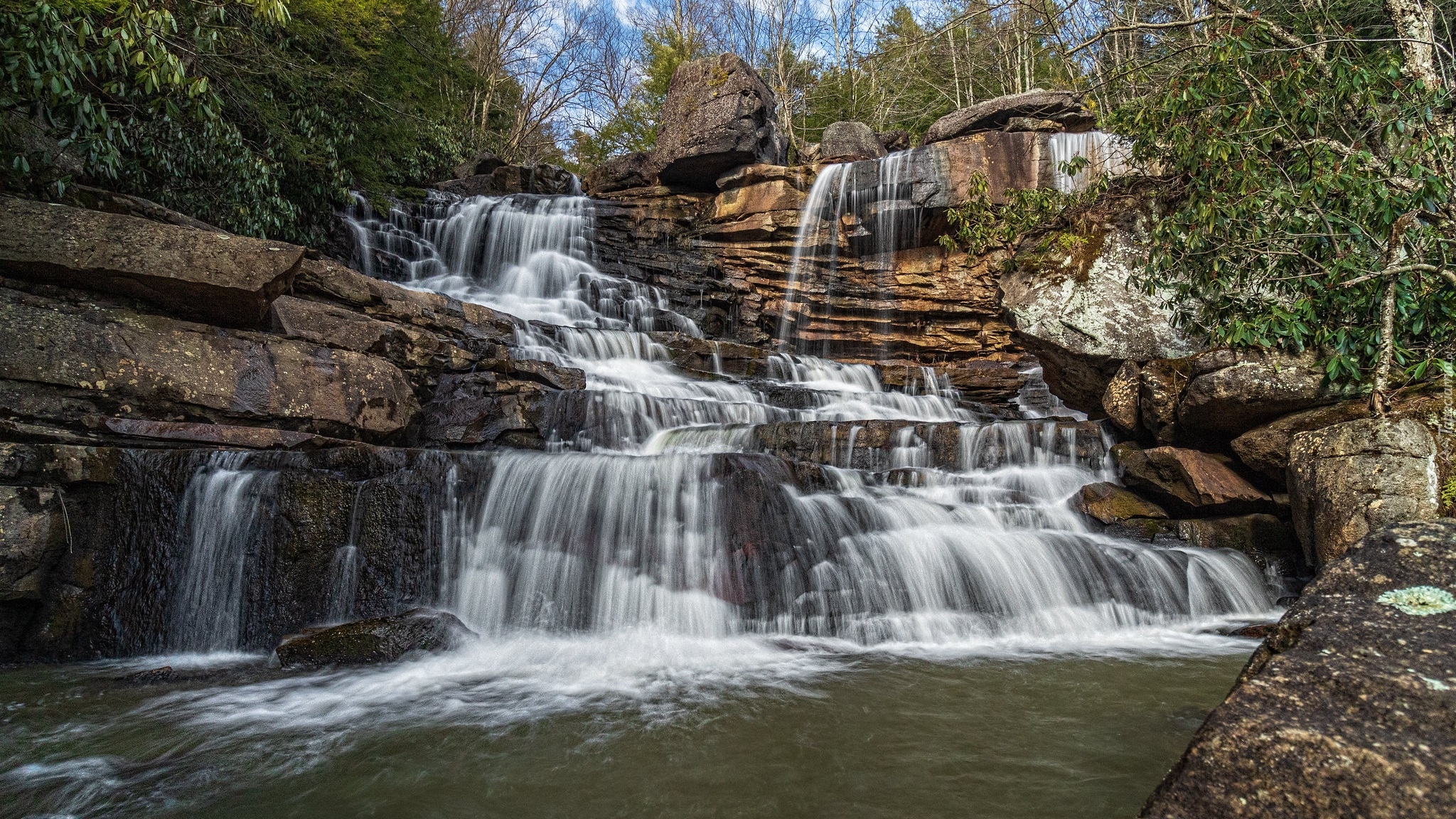 Edytor tapety: Drzewa przy wodospadzie spływającym ze skał do rzeki