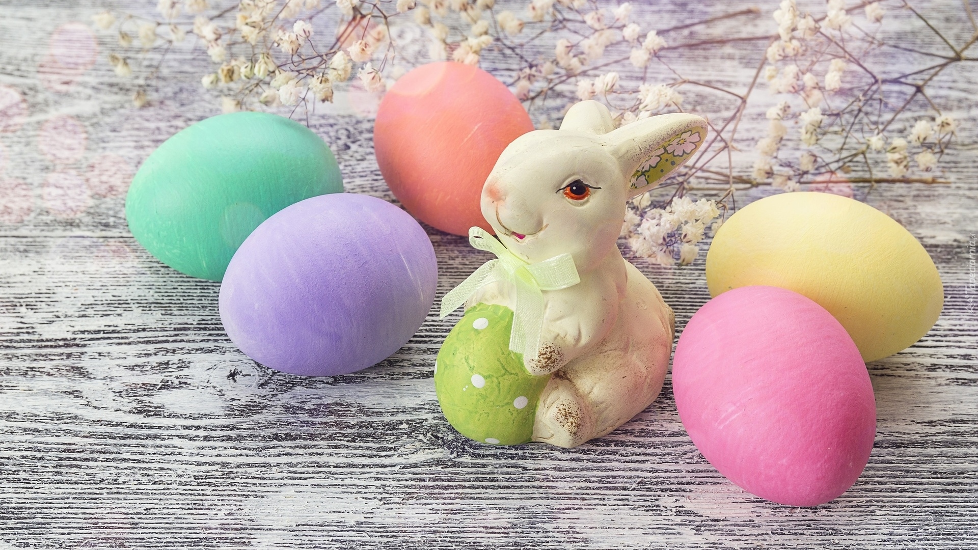 Edytor tapety: Figurka zajączka i pisanki na deskach
