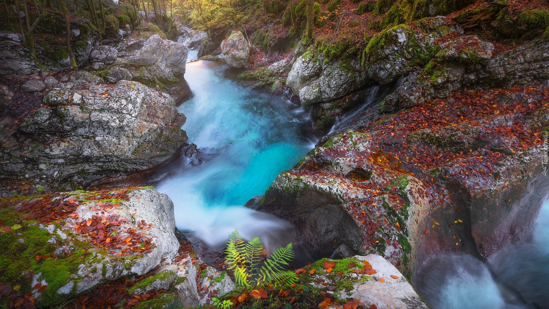 Edytor tapety: Rwąca rzeka płynąca między skałami w lesie