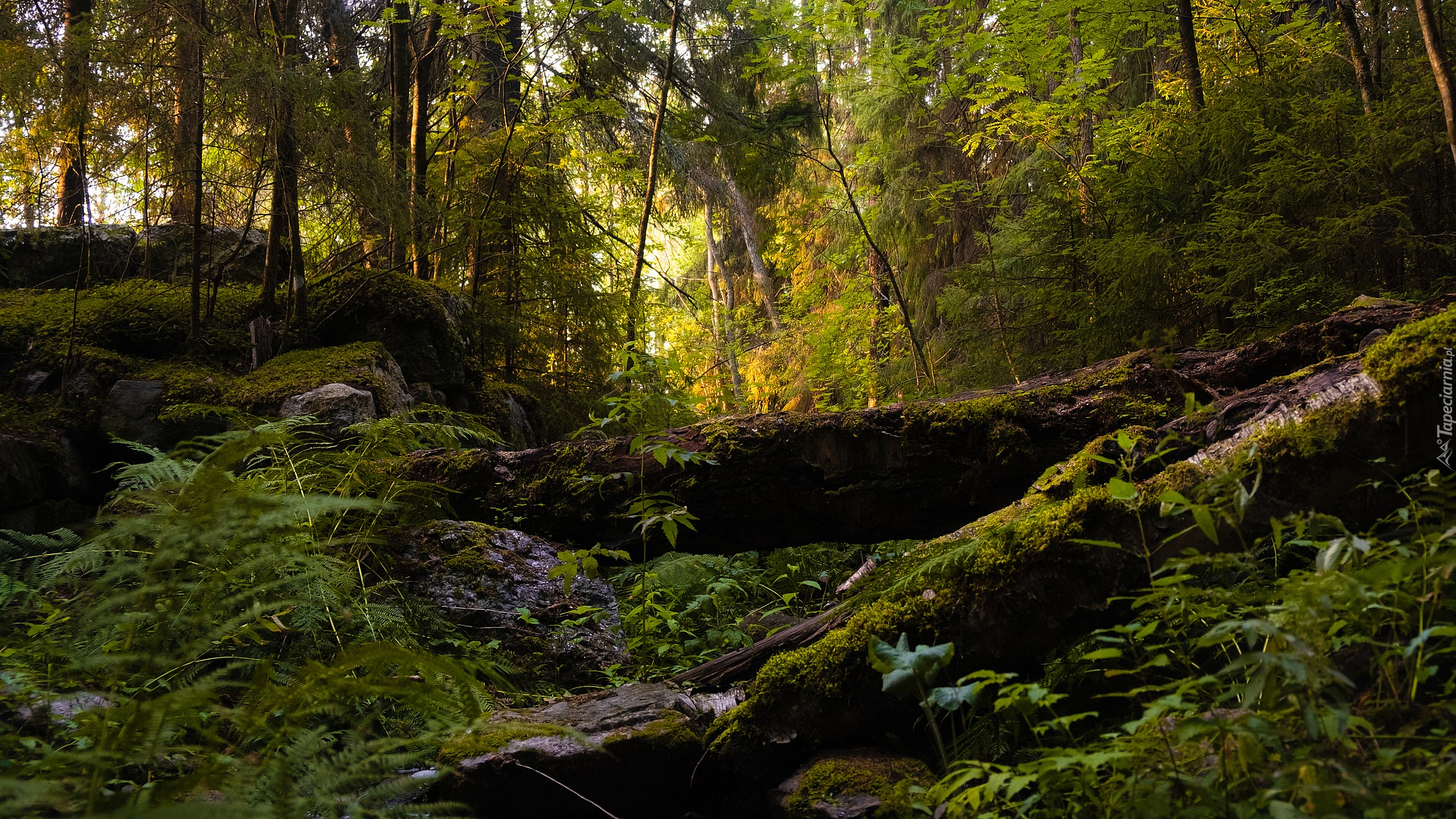 Edytor tapety: Omszałe powalone drzewa w środku lasu